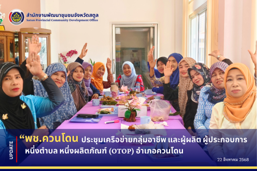 ?นางสาวยารอน๊ะ หลังเกตุ พัฒนาการอำเภอควนโดน มอบหมายให้นางสาวสาน๊ะ เตบสัน พัฒนากรผู้รับผิดชอบงาน OTOP ระดับอำเภอ ดำเนินการจัดประชุมคัดเลือกคณะกรรมการเครือข่ายกลุ่มอาชีพ และผู้ผลิต ผู้ประกอบการ หนึ่งตำบล หนึ่งผลิตภัณฑ์ในระดับอำเภอ เพื่อทบทวนและคัดเลือกคณะกรรมการเครือข่ายกลุ่มอาชีพ และผู้ผลิต ผู้ประกอบการหนึ่งตำบล หนึ่งผลิตภัณฑ์ อำเภอควนโดน ตามแนวทางระเบียบกรมการพัฒนาชุมชน ว่าด้วยการดำเนินงานเครือข่ายกลุ่มอาชีพ และผู้ผลิต ผู้ประกอบการหนึ่งตำบล หนึ่งผลิตภัณฑ์ พ.ศ. 2568 ให้เป็นปัจจุบันแทนคณะกรรมการฯ ที่ได้หมดวาระไป เพื่อให้การขับเคลื่อนการดำเนินงานของเครือข่ายกลุ่มอาชีพ OTOP อำเภอควนโดน ดำเนินการได้อย่างต่อเนื่องและมีประสิทธิภาพต่อไป